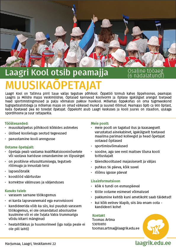 Ootame Laagri Kooli peamajja toredat muusikaõpetajat!