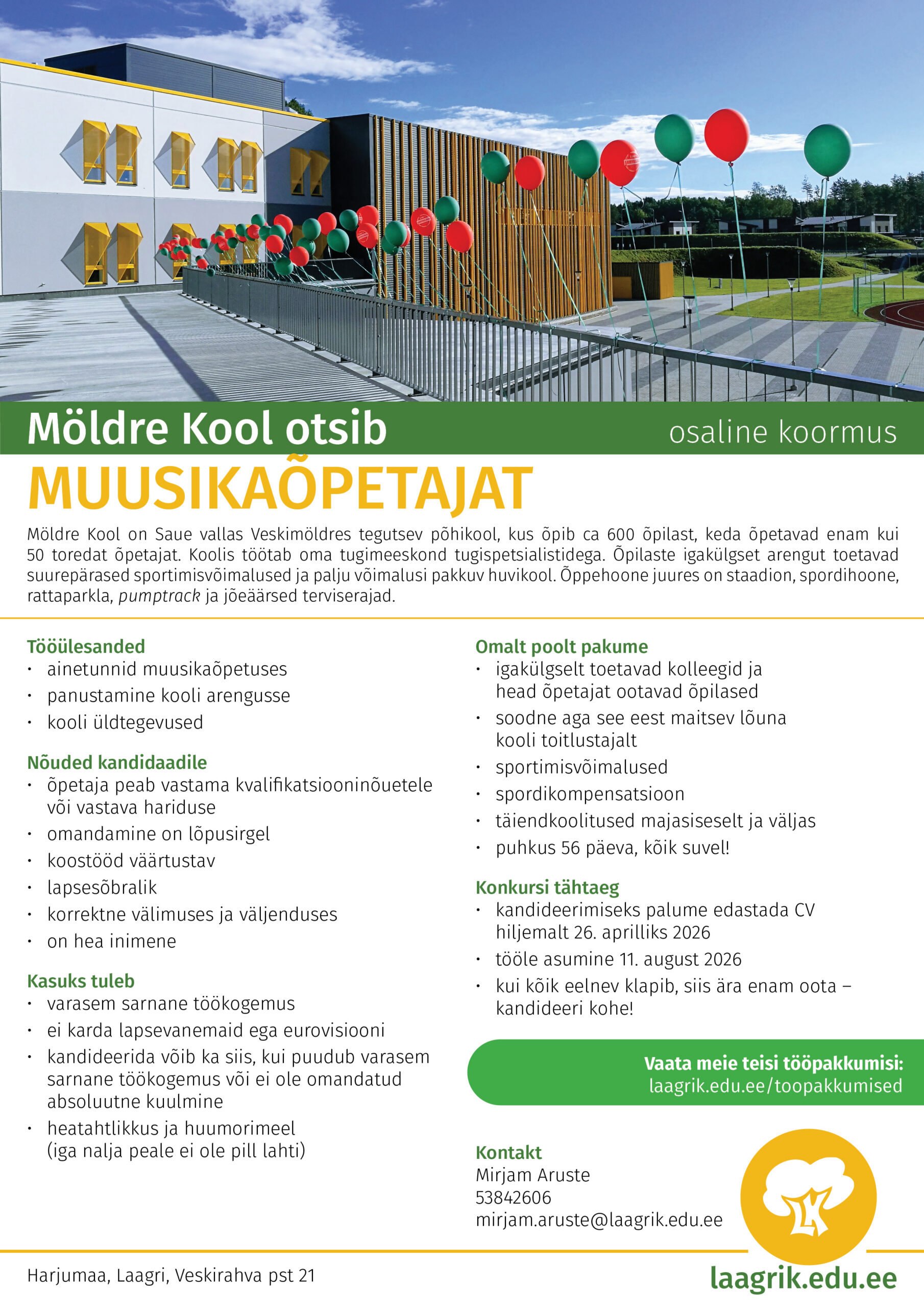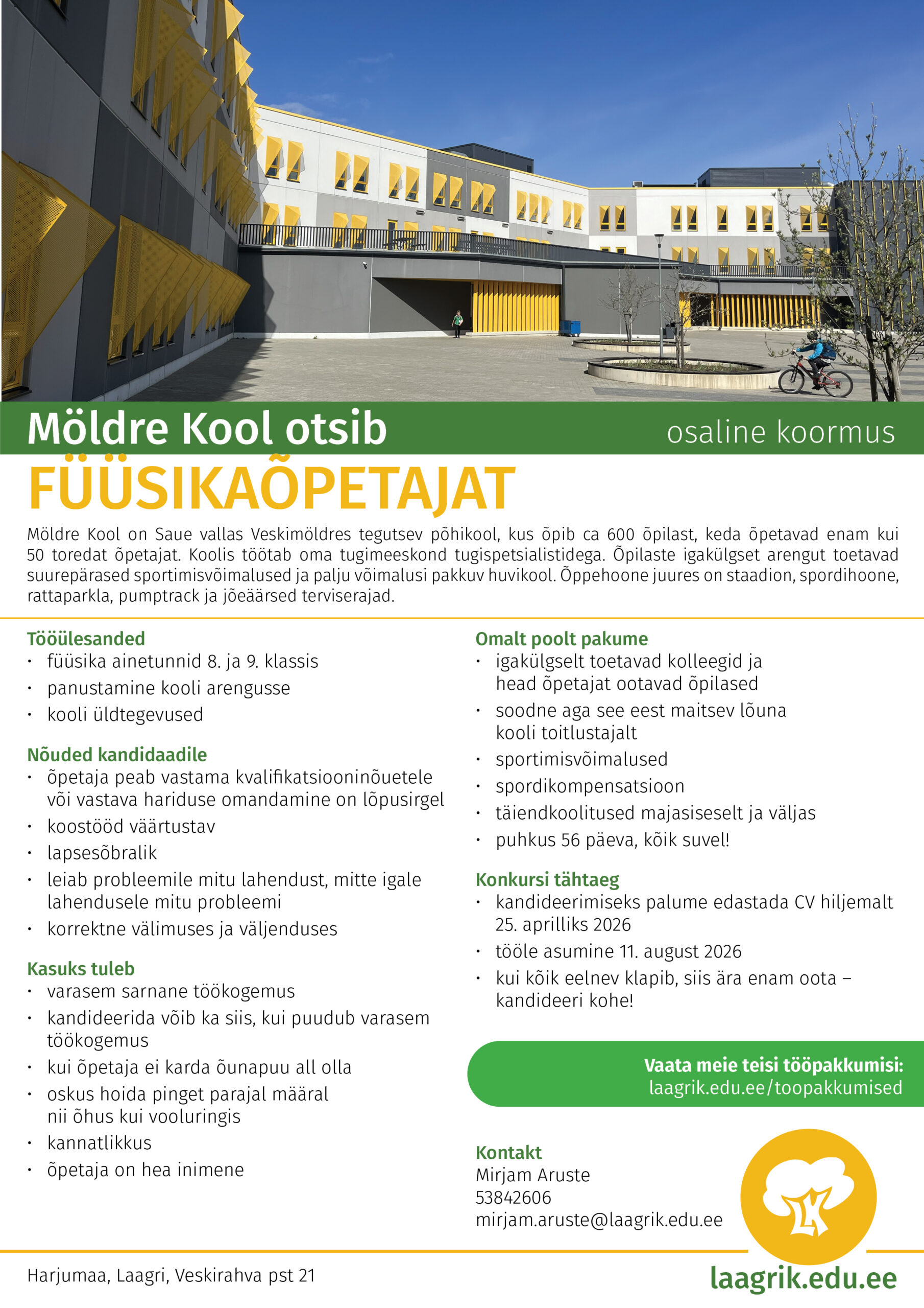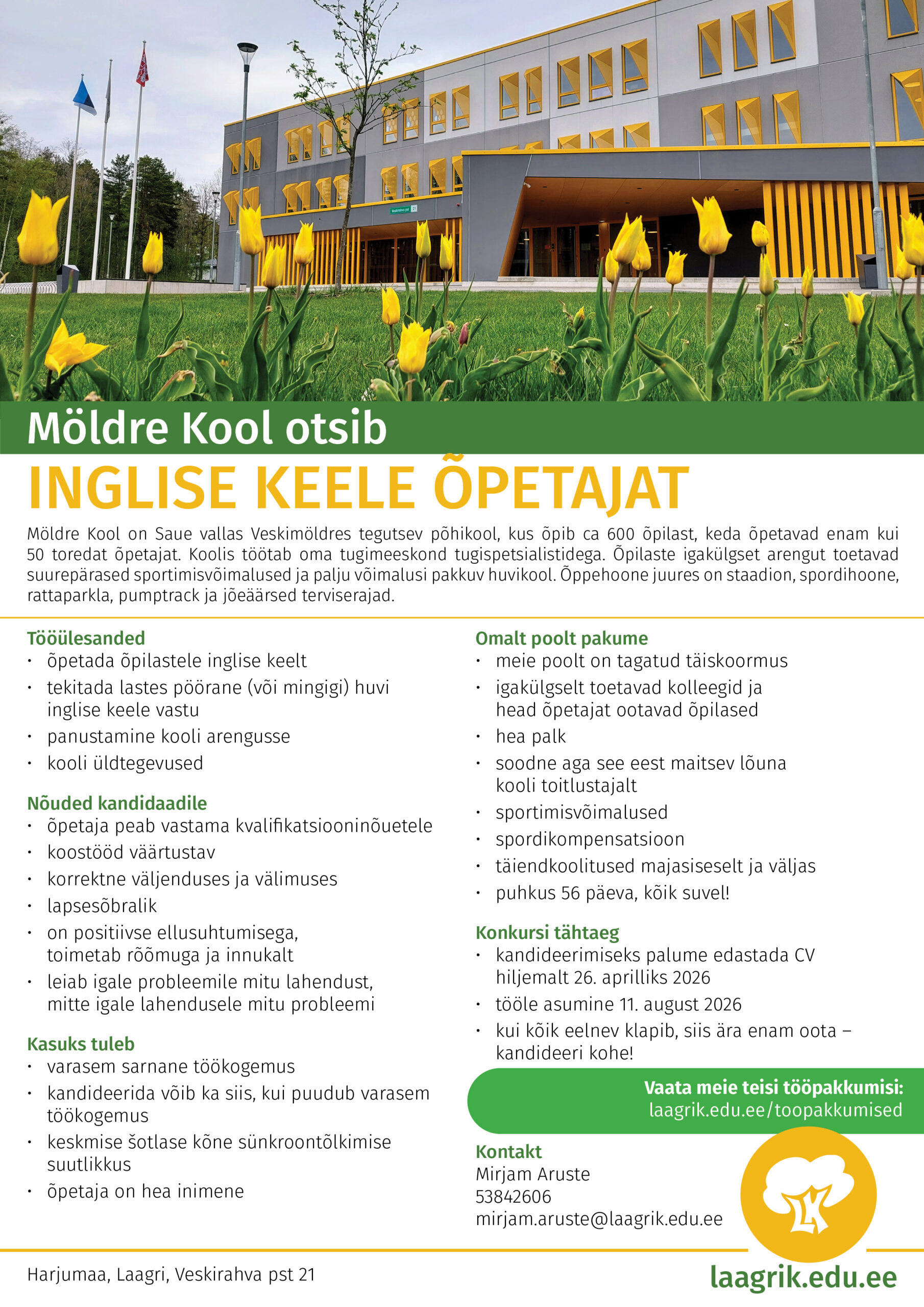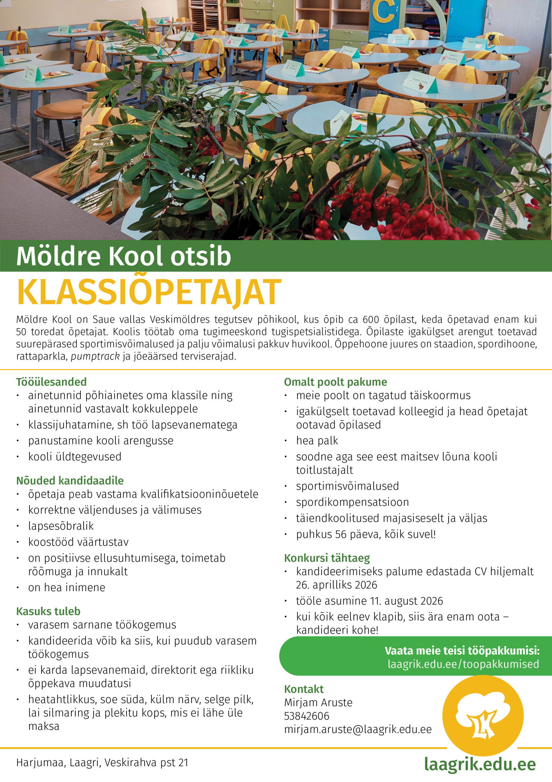 Laagri Kooli Möldre maja (tulevane Möldre Kool) tööpakkumised